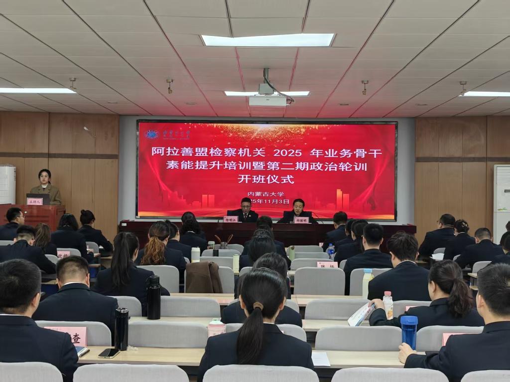 为进一步加强阿拉善盟检察队伍建设,提升业务骨干的专业素养和履职能力,“阿拉善盟检察机关2025年业务骨干素能提升培训暨第二期政治轮训”于2025年11月3日在我校赛罕校区开班。内蒙古自治区人民检察院阿拉善盟检察分院党组成员、副检察长侍明江出席开班仪式并作动员讲话,内蒙古大学继续教育学院院长郑丽明致辞。